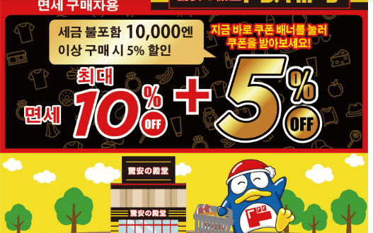 돈키호테 할인 쿠폰은 1만 엔 이상 구매한다면 면세 10%에 5% 할인 추가해서 총 15% 할인을 받을 수 있습니다. 추가로 돈키쿠폰 채널을 카카오톡에 추가하면 만 엔 이상 구매 시 5% 추가 할인을 받을 수 있습니다. 외국인들을 위한 면제 전용 카운터가 있습니다. 여권을 준비하고 만 엔 이상 구입하면 면세 10%에 5%를 추가해서 할인받을 수 있습니다.