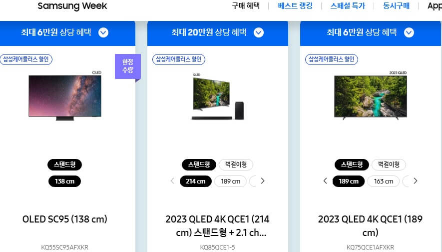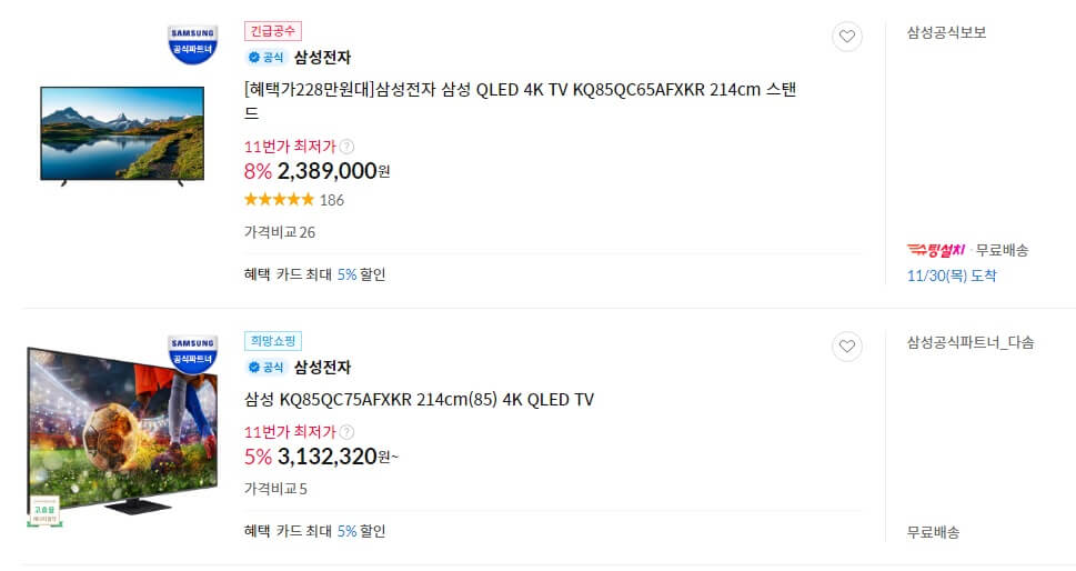 11월 1일부터 11월 30일까지 진행하는 한국형 블랙프라이데이, 삼성위크 코리아세일 페스타를 기준으로 가격 비교를 해보았습니다. 삼성전자 LG 전자 모두 마찬가지입니다. 여기선 삼성전자를 예로 들었습니다.