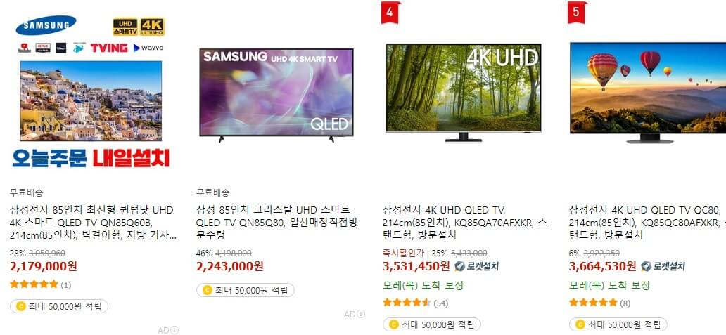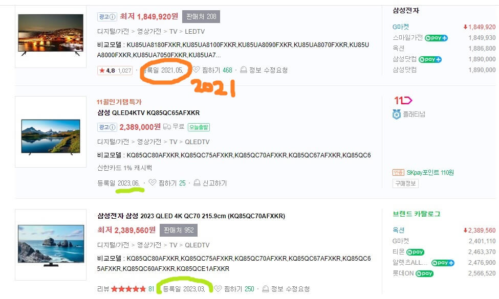 가격비교로 검색해서 살 수 있는 최대 쇼핑몰 중 하나입니다. 스펙 키워드로 검색해 봅니다. 삼성전자, 85인치, QLED가 키워드였죠. 1,849,920원. 더 저렴한 제품을 찾았습니다. 그런데 문제가 있네요. 2021 연식이네요. 2년 지난 재고 상품입니다.