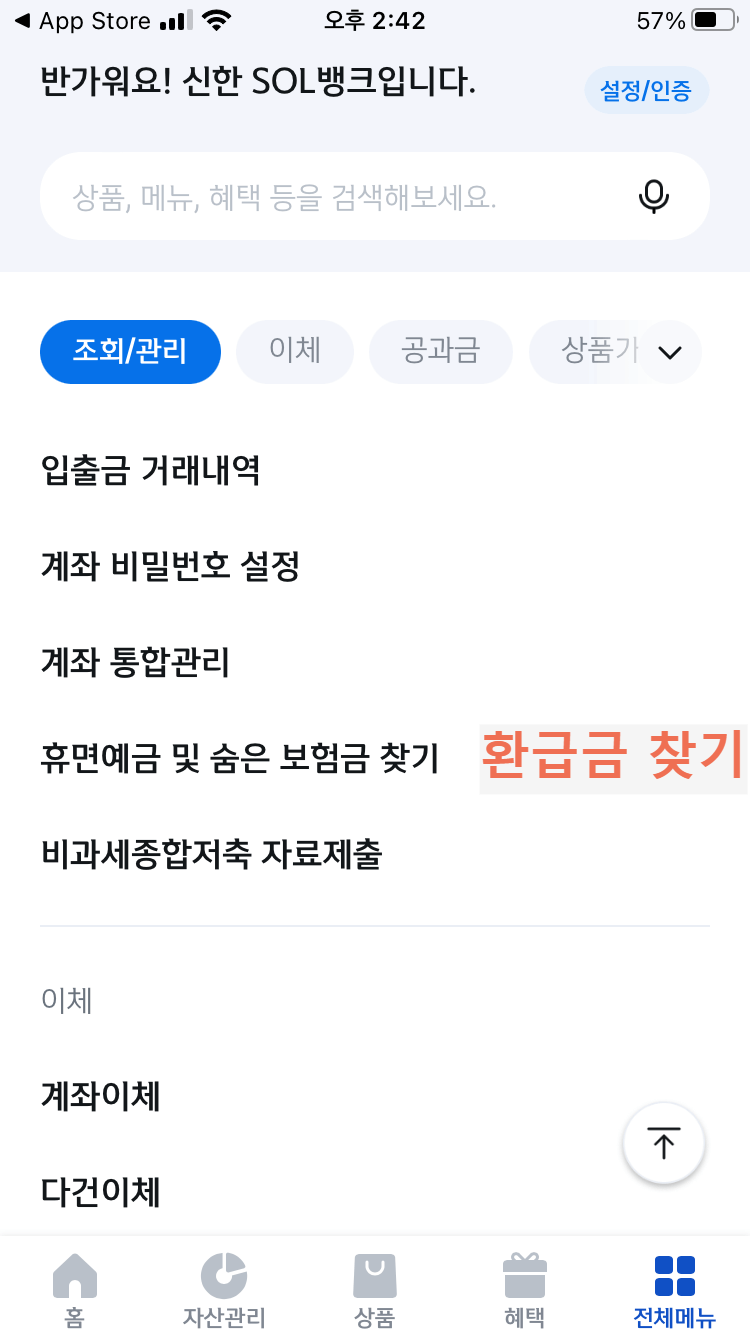 신한은행 어플을 통해서만 환급금 신청이 가능합니다. 어처구니가 없지만, 한번 어플실행으로 실제 가능한지 찾아보았습니다.