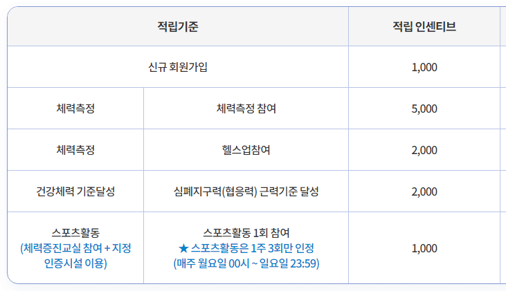 국민체력 홈페이지에 가입한 후, 체력인증센터를 방문해서 체력측정을 하면 포인트가 적립됩니다. 체력증진센터에 참여하여 포인트를 적립시키는 시스템입니다.