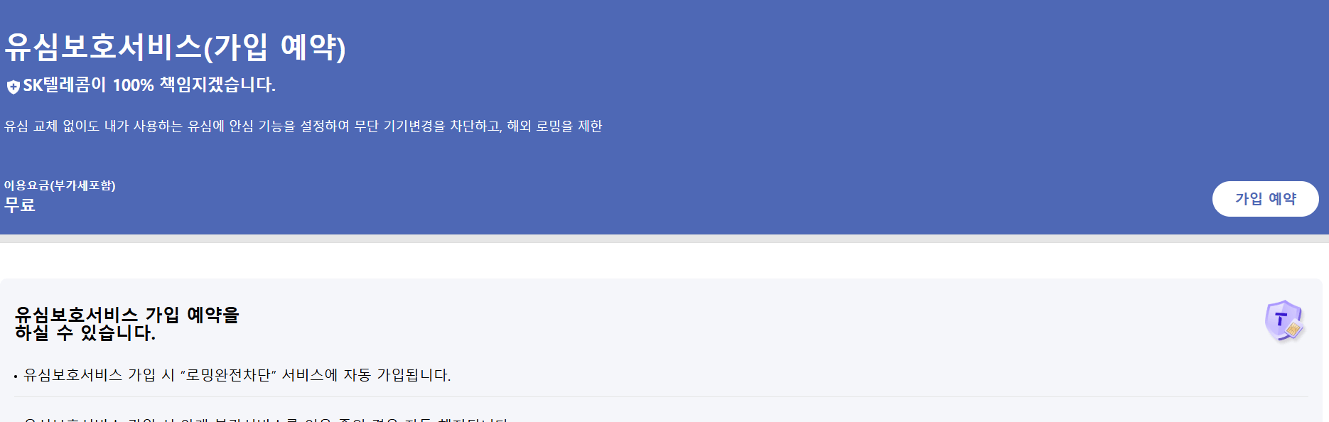 현재 sk 유심 보호 서비스를 진행하고 있습니다. skt 유심 보호서비스에서 본인 인증을 하신 후 신청할 수 있습니다.